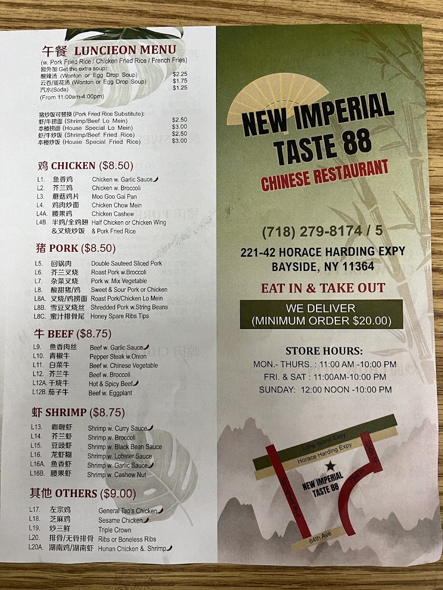 Welcome to Imperial Taste, a gem located in the heart of Oakland Gardens, NY. This inviting eatery stands out in a bustling neighborhood for its vibrant flavors and impressive array of dishes that capture the essence of authentic Chinese cuisine. Situated at 221-42 Horace Harding Expy, this establishment has quickly garnered a loyal customer base, drawn in by the promise of fresh, high-quality meals.